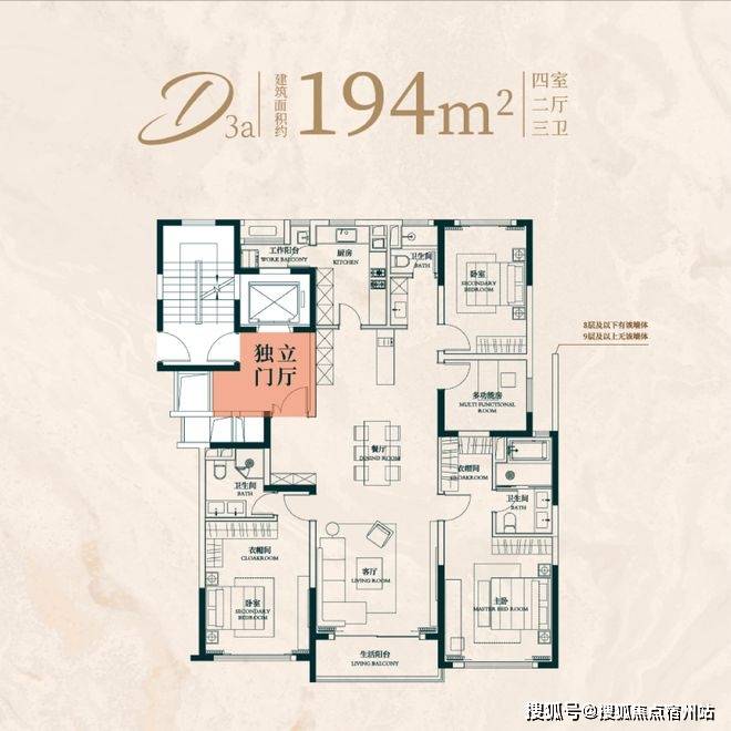 该户型的亮点是双套房的装备。并且你注重看,2个套房布列客堂掌握,而且装备极为相同。如许两代人不只维持了各自独立性和私密性,正在适意度上也亲昵。