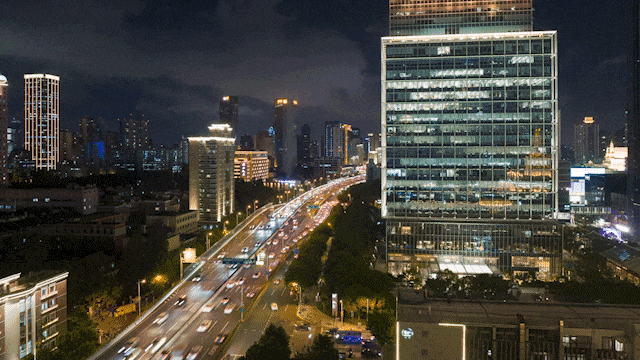 立面采用米黄色石材,仿古铜色的金属线条,再配合大面积玻璃的通透视感,超高的窗墙比,高级感不问可知。