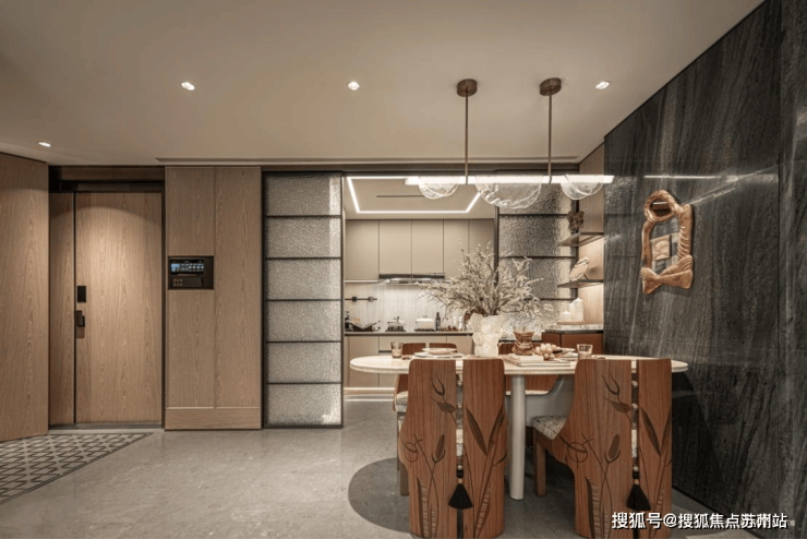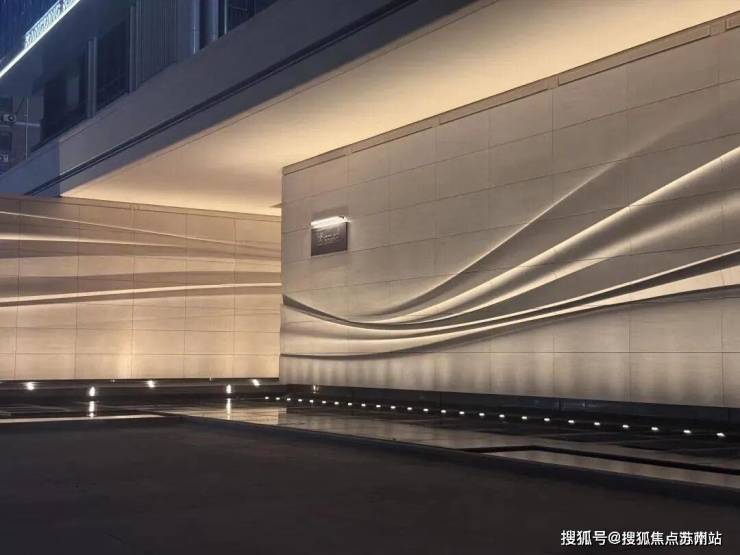 采用米黄色温润石材,奇妙模仿风的贯通形状,营制出既持重又安宁的归家气氛。这片宏壮的流线型石墙正在温柔灯光的映衬下,更显璀璨属目,而风雨连廊的灯带打算,更添一份显贵典礼感。