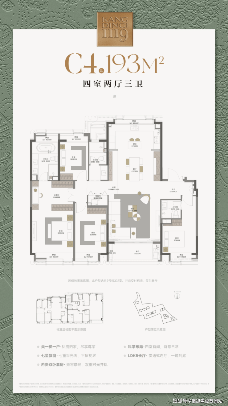 以修面约193户型为例,卫浴兴办采用邦际品牌如唯宝、高仪、卡德维等,厨电品牌采用嘉格纳,全套设备油烟机、灶台、洗碗机、双开门冰箱、蒸烤一体机等,同时装置德邦美诺洗衣机烘干机套装。